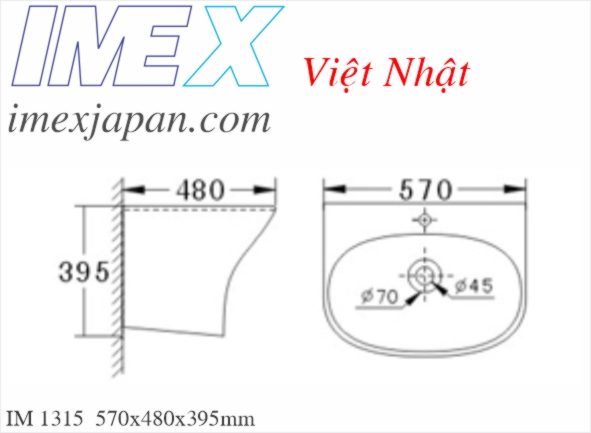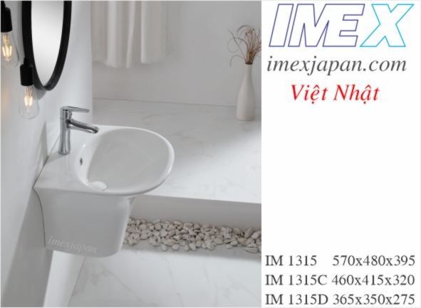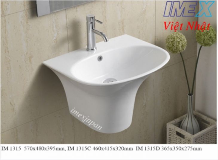 Lavabo treo liền khối IM 1315 có xả chống tràn men sứ Grade A Nano chống bám bẩn, được sản xuất trên dây chuyền công nghệ cao của hãng IMEX bảo hành phần sứ 5 năm wall-hung basin installation, kích thước 570x480x395mm