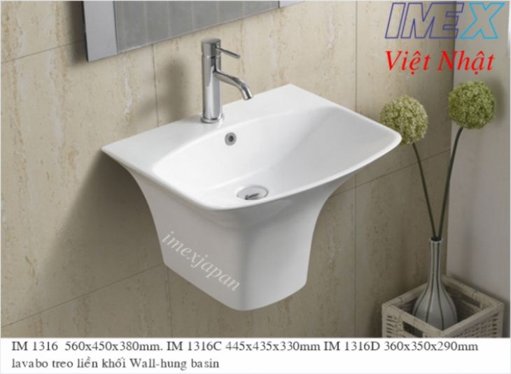 vị trí 403 Lavabo treo liền khối IM 1316C có xả chống tràn men sứ Grade A Nano chống bám bẩn, được sản xuất trên dây chuyền công nghệ cao của hãng IMEX bảo hành phần sứ 5 năm wall-hung basin installation, kích thước 445x435x330mm