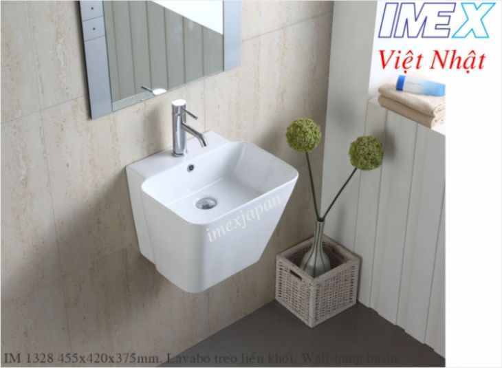 vị trí 408, Lavabo treo liền khối IM 1328 có xả chống tràn men sứ Grade A Nano chống bám bẩn, được sản xuất trên dây chuyền công nghệ cao của hãng IMEX bảo hành phần sứ 5 năm wall-hung basin installation, kích thước 455x420x375mm