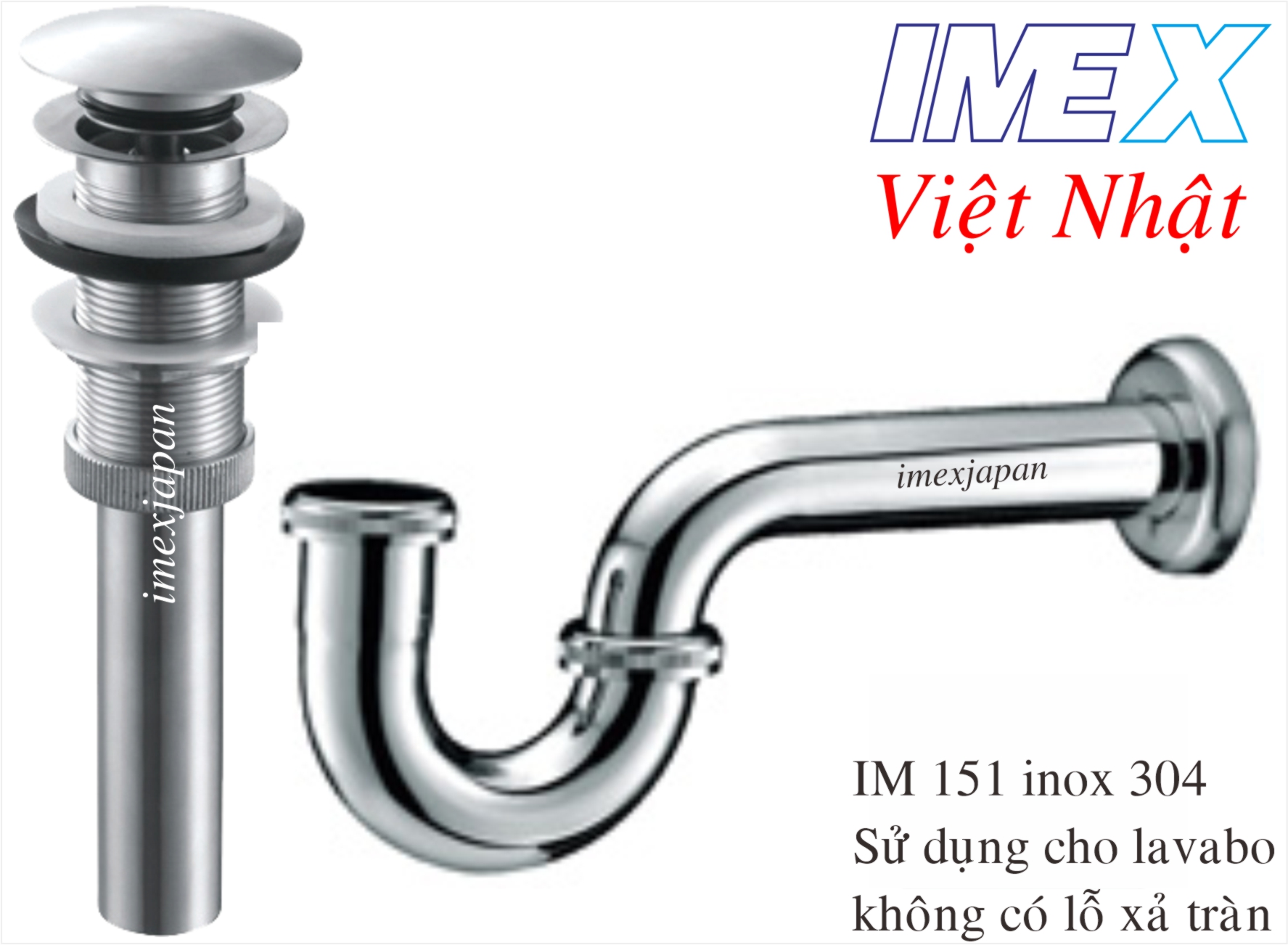 Xả lavabo nhấn Imex Việt Nhật IM 151 Chất liệu: inox mờ 304 cùng đuôi ống cong Chế độ xả: Xả nhấn. Có lọc tóc rút lên để vệ sinh không sợ bị nghẹt. Lắp cho lavabo không có lỗ xả tràn. Dễ dàng lắp đặt mà không cần gọi thợ.