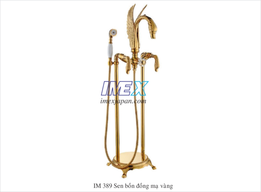vòi sen bồn tắm thiên nga 2 chức năng. Vòi sen linh hoạt, cấp nước cho bồn tắm. Khóa mở nước và chỉnh nóng lạnh bằng 2 tay gạt. Chất liệu đồng mạ vàng. Cấp nước từ dưới nền nhà lên.