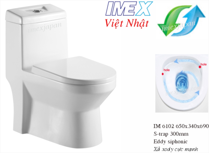 Bàn cầu 1 khối, nắp rơi êm nhựa UF, xả nhấn 3/6 lít, tim xả trên sàn S-trap 300mm. Hệ thống xả Siphonic - Tornado đẩy và hút men nano chống bám bẩn,vị trí 204