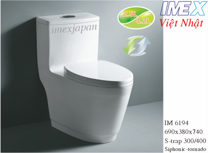 Bàn cầu 1 khối, nắp rơi êm nhựa UF, xả nhấn 2,5/4,2 lít, tim xả trên sàn S-trap 300mm. Hệ thống xả Siphonic - Tornado đẩy và hút