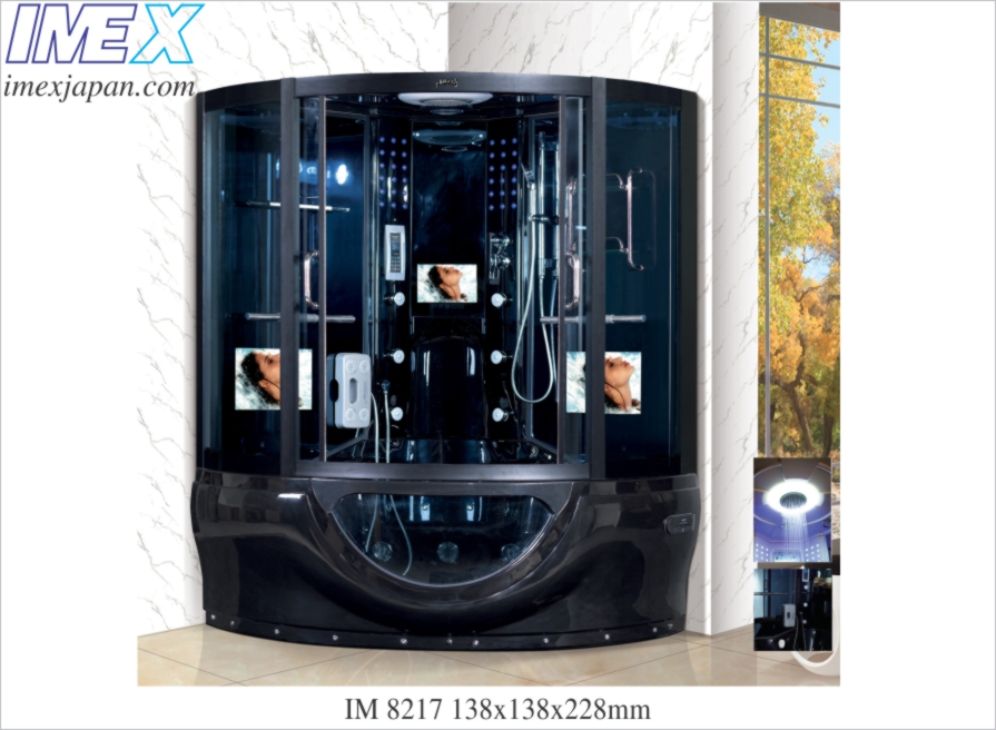 phòng tắm xông hơi massage, 6 jets massage đứng, massage ,tắm đứng bát sen chỉnh 3 chức năng chỉnh cao thấp, tắm đứng kiểu mưa, kiểu thác nước, masage chân, đèn trần, quạt hút, loa, nghe FM, điện thoại gọi đi, gọi đến, khử trùng ozone, điều khiển từ xa. Kích thước: 1500*1500*2280mm