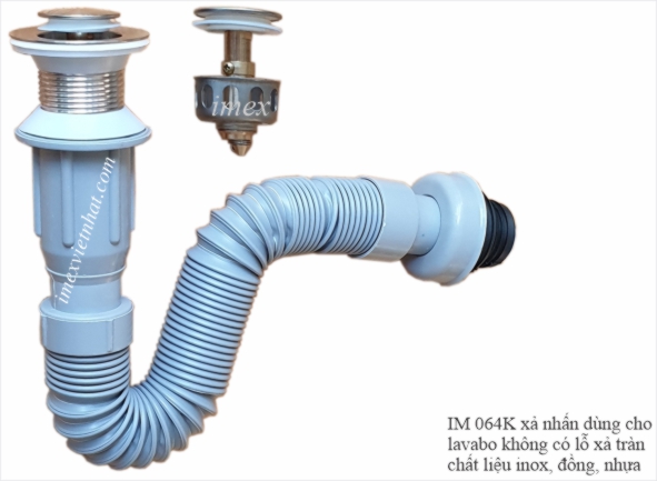 xả lavabo nhấn sử dụng cho lavabo không có lỗ xả tràn, nhấn có lọc tóc rút lên để vệ sinh không sợ bị nghẹt chất liệu đầu xả bằng inox, đồng thân bằng nhựa ống mềm linh hoạt bẻ theo ý muốn.