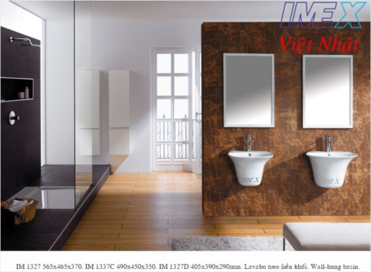 Vị trí 404, Lavabo treo liền khối IM 1327 có xả chống tràn men sứ Grade A Nano chống bám bẩn, được sản xuất trên dây chuyền công nghệ cao của hãng IMEX bảo hành phần sứ 5 năm Wall-hung Basin Installation.