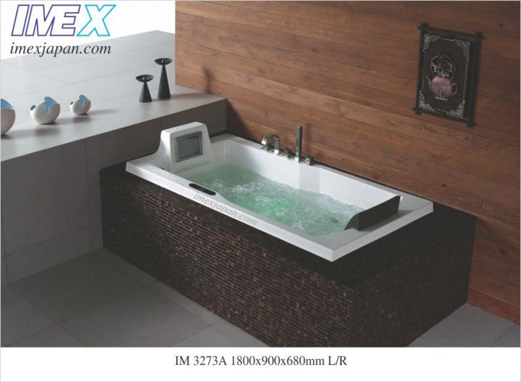 Bồn tắm nằm massage, không có vách. masage tạo sóng 1.5 ngựa, massage sục khí 300w, vòi sen 3 chức năng linh hoạt, vòi cấp nước, 1 gối, có tivi 8.5", nghe FM, kết nối CD, 1 đèn đổi màu, điều khiển từ xa, Kích thước: 1800*900*680mm