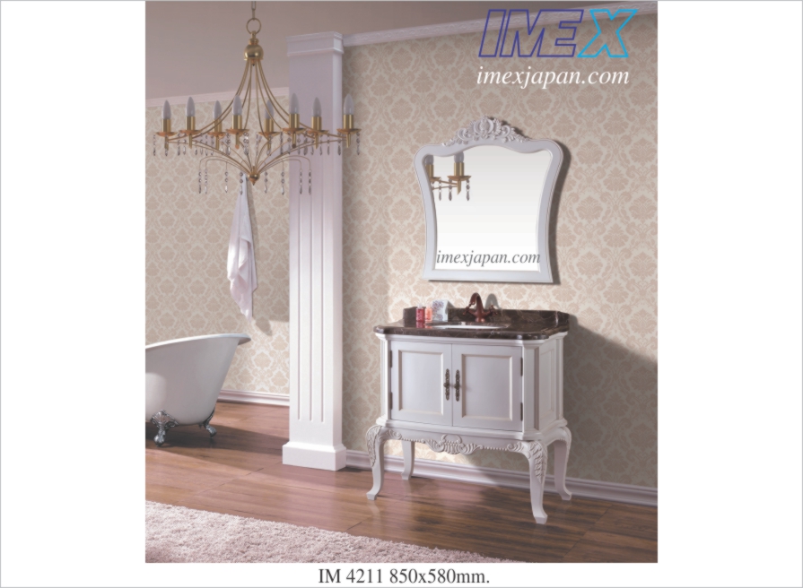 lavabo tủ gỗ kiểu cổ điển, mặt đá, tô sứ có xả chống tràn, bao gồm vòi, xả, kiếng soi, kích thước: 85x88cm.