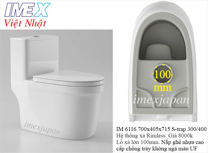 Bồn cầu 1 khối IM 6116 lỗ xả lớn 100mm. 715x405x715 S-trap 300/400 hệ thống xả Rimless 100, nắp ghế nhựa cao cấp UF chống trầy